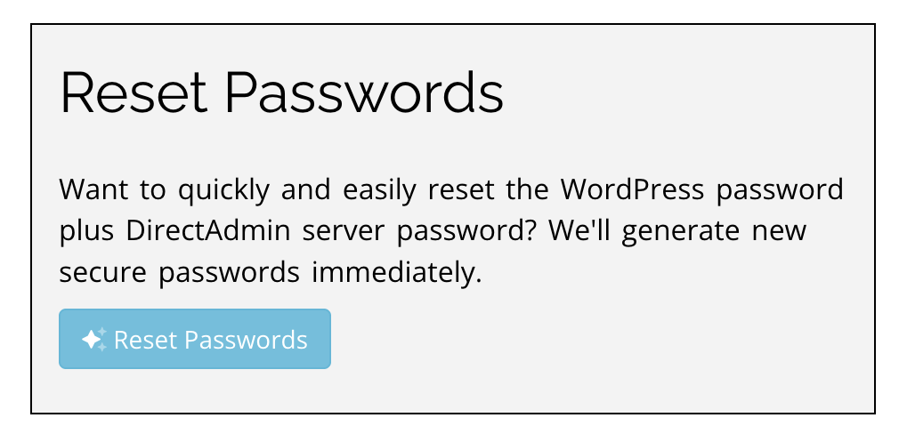 If you want to reset the WordPress admin password and/or the DirectAdmin password, our system has a built in feature to generate a secure new password for both accounts.